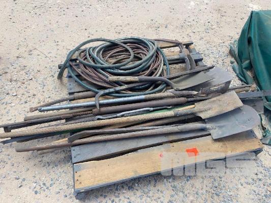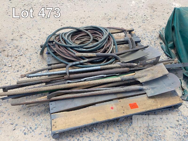 ASSORTED SHOVELS, CROW BAR, PICKS & HOSE