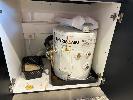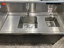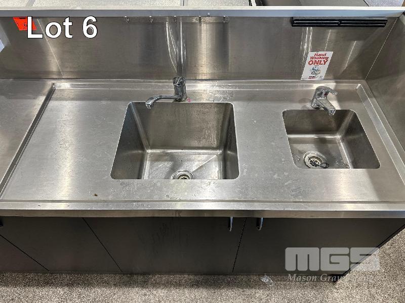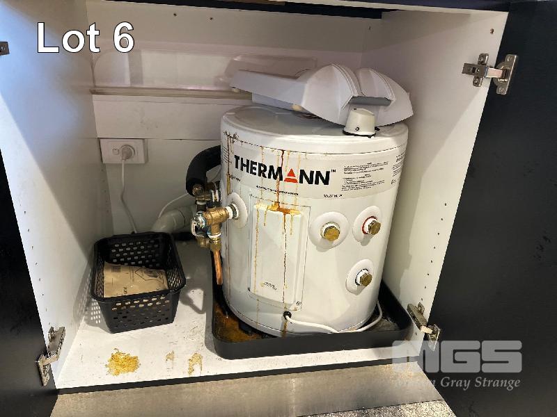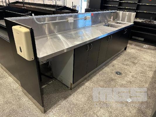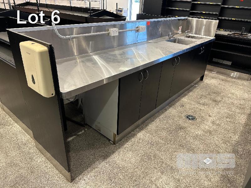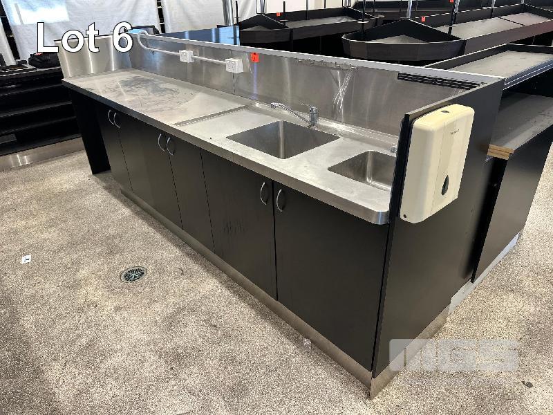 LARGE STAINLESS STEEL BENCH WITH DEEP BOWL SINK, HAND WASH SINK & SPLASHBACK, MOUNTED ON BLACK TIMBER LAMINATE BASE, 6 DOOR STORAGE, 3300 x 700 x 900mm (H) WITH THERMANN HOT WATER UNIT, CAP: 25L, 240V