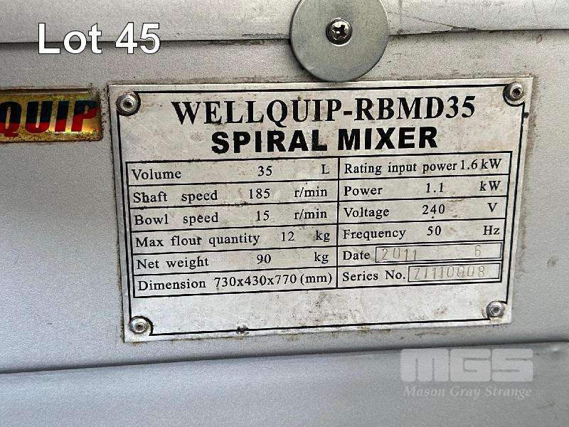 SPIRAL MIXER, WELLQUIP MOD: RBMD35 CAP: 35 LITRE DOM: 2011 240V, 15 AMP PLUG