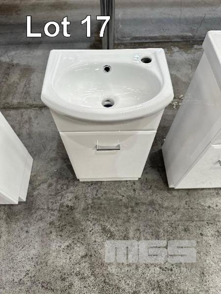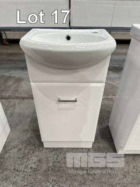 BATHROOM VANITY WITH CHINA TOP SINK, WHITE, SINGLE DOOR, CHROME HANDLE, 420 x 295 x 880mm (H) RRP $394.66, NEW IN BOX!