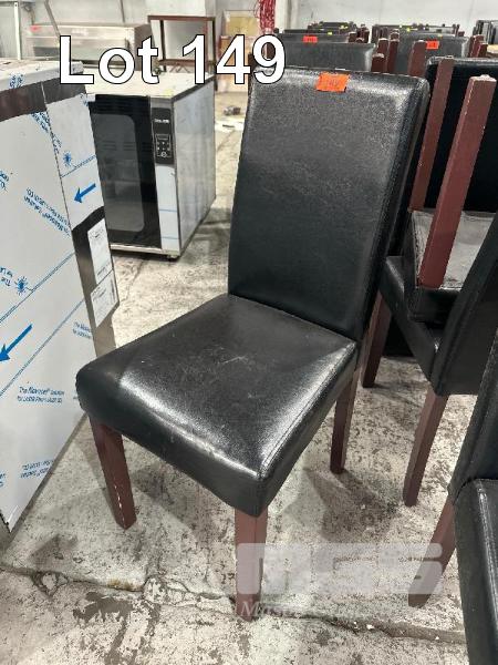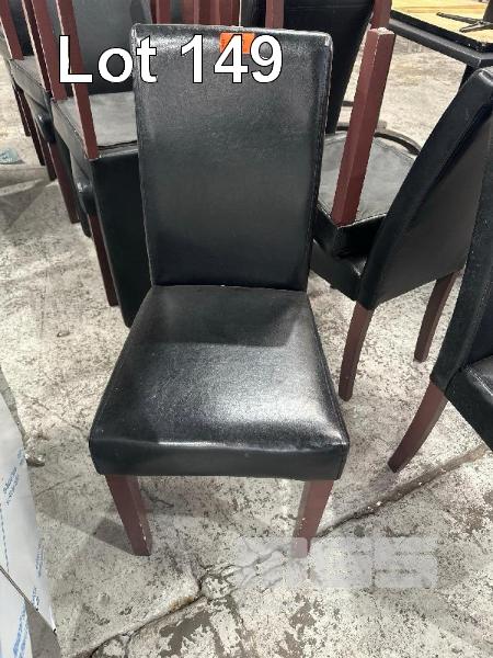 10 x CAFE CHAIRS, BLACK LEATHER, BROWN TIMBER LEGS