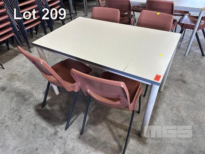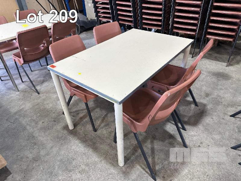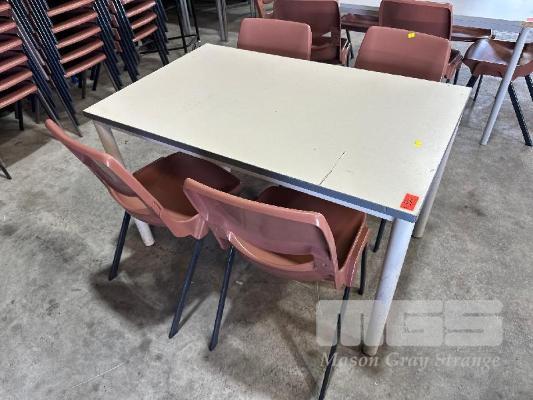 CLASSROOM DESK, WHITE STEEL FRAME, LAMINATE TOP 1200 x 750mm WITH 4 x SEBEL STACKABLE CHAIRS MADE IN AUSTRALIA