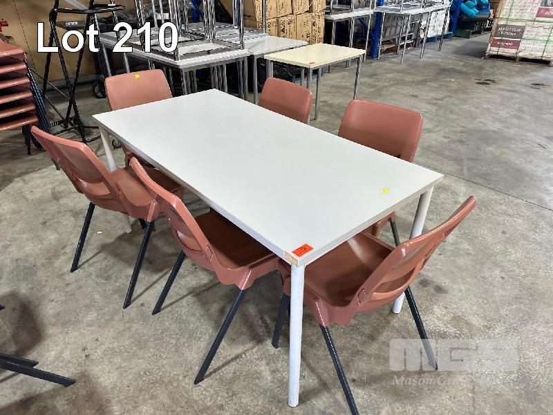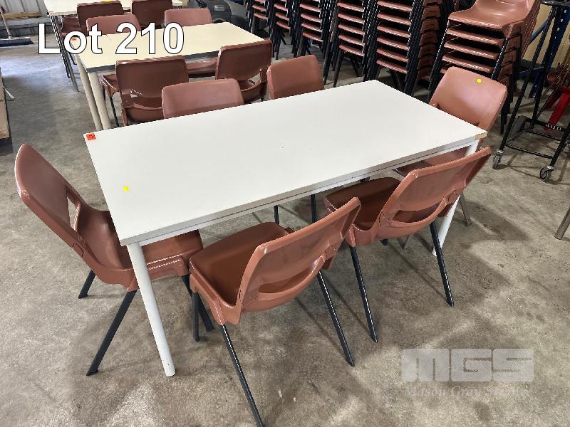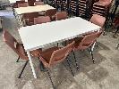 CLASSROOM DESK, WHITE STEEL FRAME, LAMINATE TOP 1500 x 750mm WITH 6 x SEBEL STACKABLE CHAIRS MADE IN AUSTRALIA