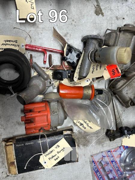 VARIOUS HOLDEN ACCESSORIES INCLUDING DISTRIBUTOR, THERMOSTATS. MASTER CYLINDERS, THERMOSTAT HOUSING, SLAVE CYLINDER, V8 PISTON RINGS, ETC