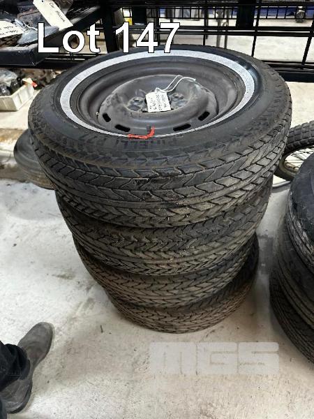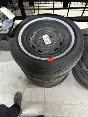 4 x HOLDEN HK STANDARD RIMS & TYRES, WHITE WALLS, 14", 5 STUD