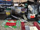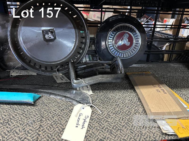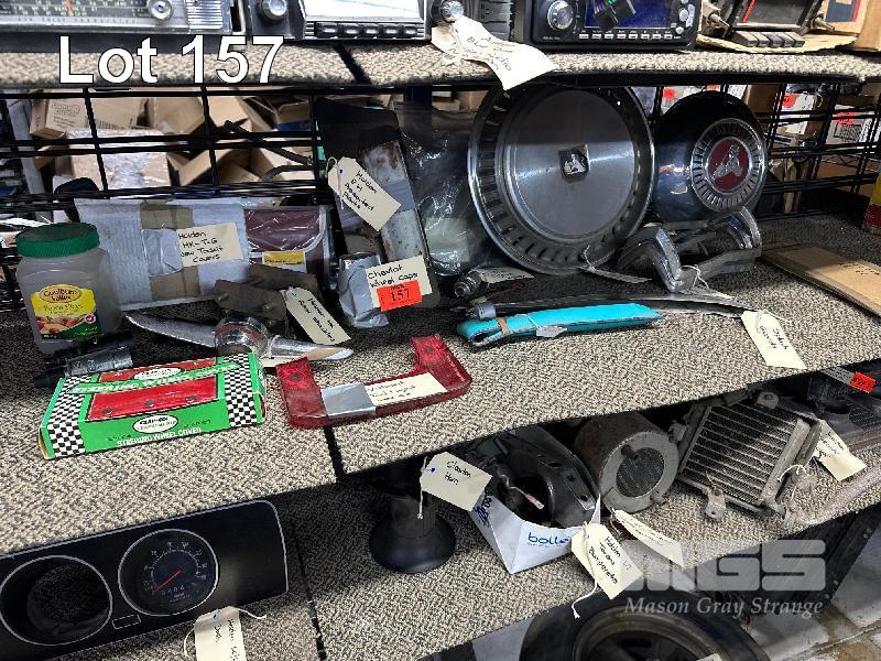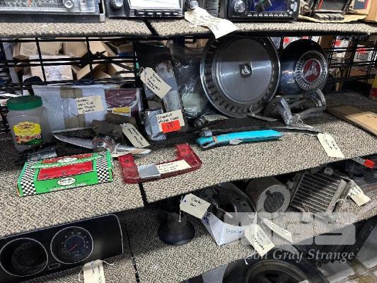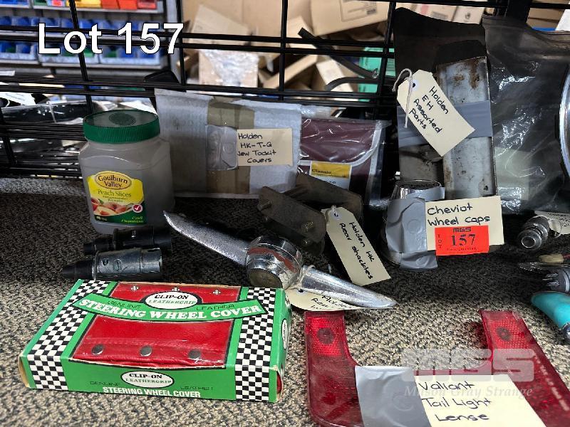 ASSORTED HOLDEN PARTS INCLUDING, BOOT LOCK, HUB CAPS, LIGHT SURROUNDS, SPLASH GUARD, REAR SHACKLES, DECALS, VALIANT TAIL LIGHT LENS, 2 x CHEV WHEEL CAPS, LEATHER STEERING WHEEL COVER, ETC CONTENTS SHELF