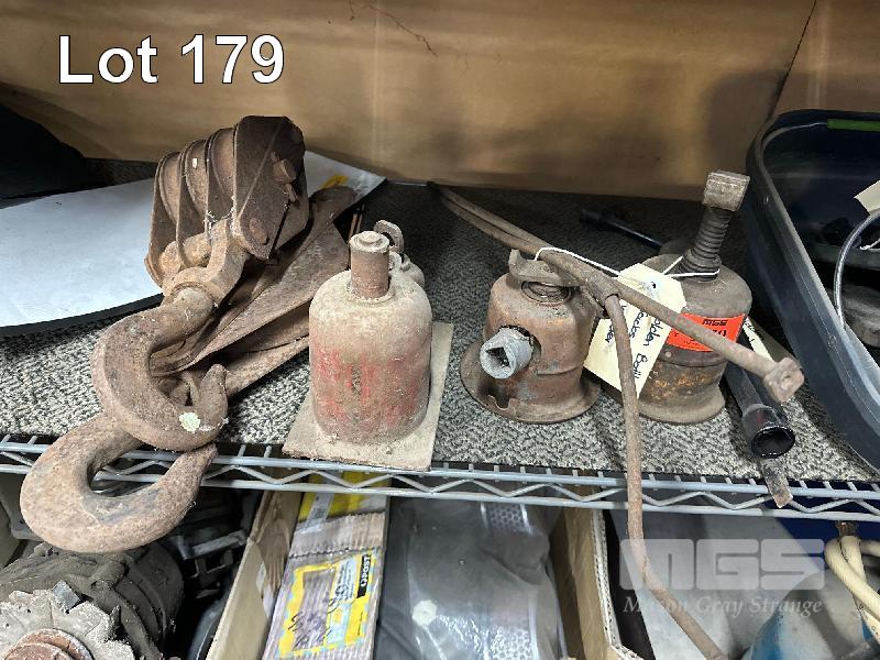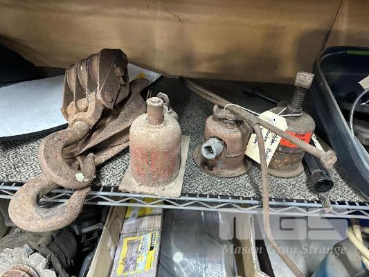 2 x HOLDEN BOTTLE JACKS, WHEEL BRACE, 6 x TOW HITCHES & 2 x PULLEYS