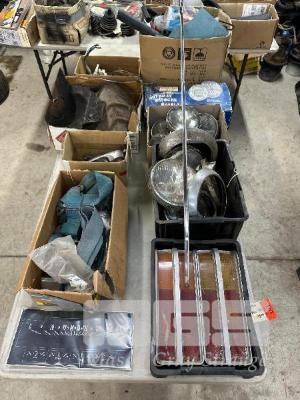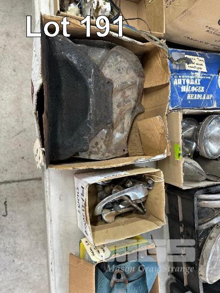 LX/LH REAR RAIL LIGHTS, 3 x BOXES SEALED BEAM HEADLIGHTS, 1 x BOX HOLDEN DOOR HANDLES, 1 x BOX HOLDEN SEAT BELTS, RED 6 MOTOR DUST COVERS, LX/LH WIRING LOOMS, 1 x BOX ASSORTED RUBBERS & HOSES, HOLDEN HK BONNET STRIP CONTENTS TABLE