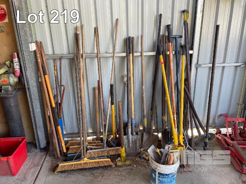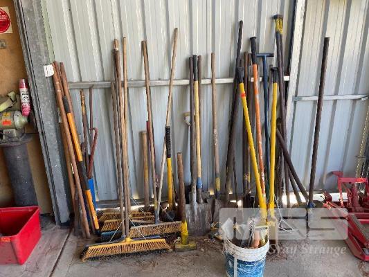 LARGE QUANTITY GARDENING/LANDSCAPING TOOLS, BROOMS, POST HOLE DIGGERS, SHOVELS, CONCRETING TROWELS, SLEDGE HAMMERS, ETC