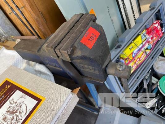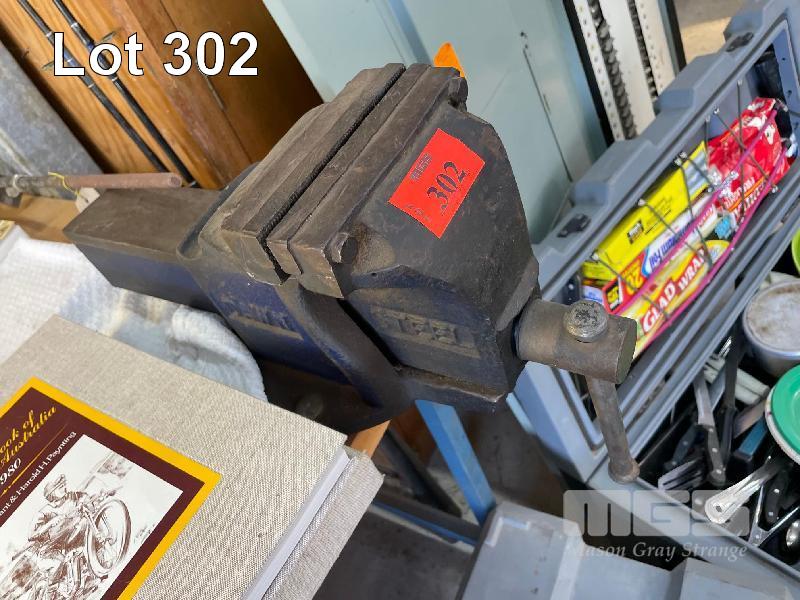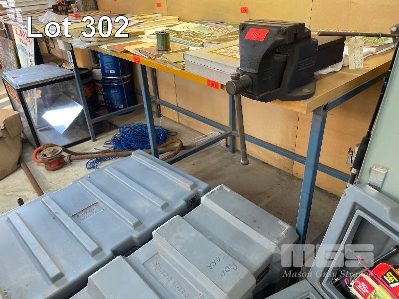 STEEL FRAME BENCH, 29000 x 800mm, TIMBER TOP, WITH DAWN 6" VICE