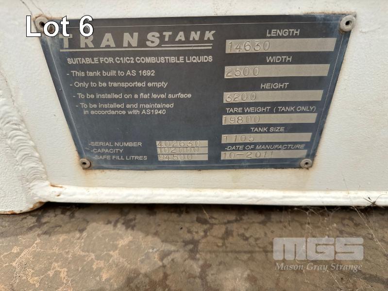 DIESEL FUEL TANK STORAGE & PUMPING No 1 94,500 LITRE CAPACITY, MAX CAPACITY: 102,000 LITRE TRANS TANK S/NO: 402630 DOM: 2011 WITH PUMP BAY KEYPAD METER/FILL (SMARTFILL) NOW LOCATED IN BROKEN HILL (DAIRY)