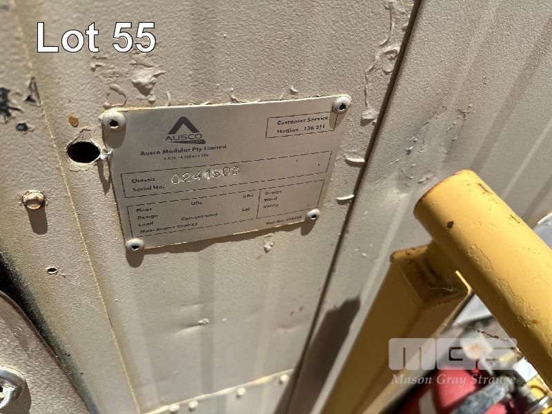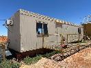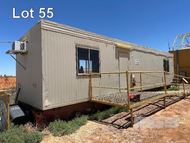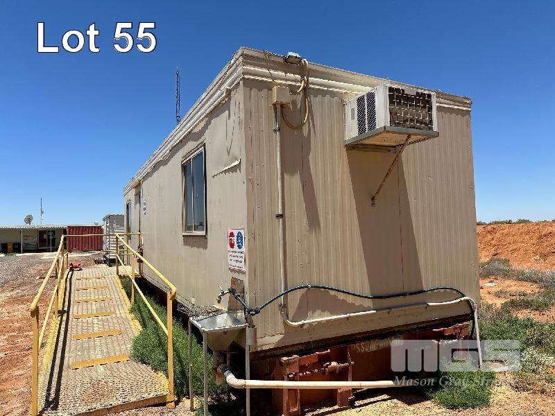 TRANSPORTABLE CRIB ROOM 12 x 3m MOUNTED ON TRANSI FLAT BASE OPEN PLAN, KITCHENETTE, TABLES, CHAIRS, PIE WARMER, 3 x WALL MOUNT A/CS, ETC