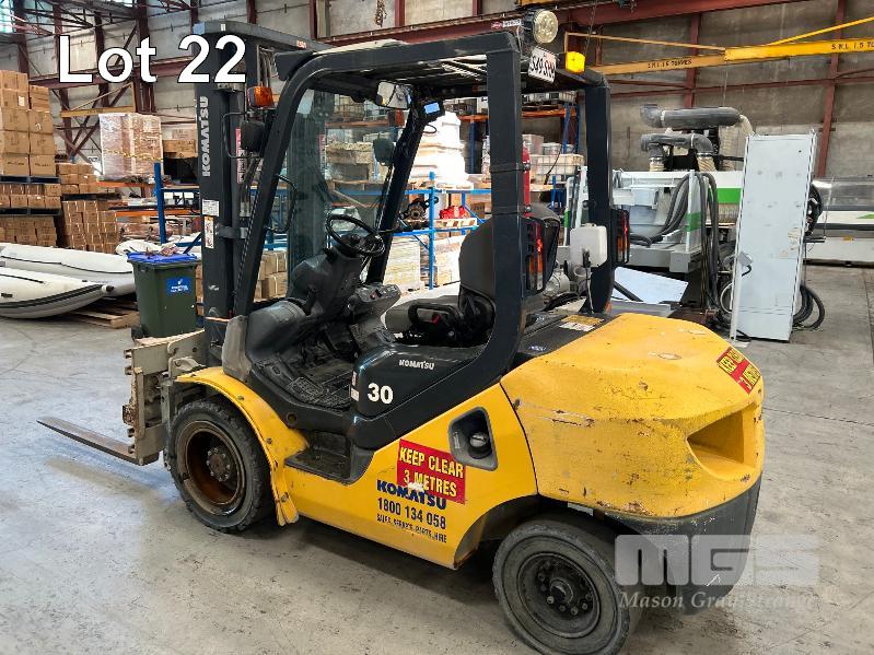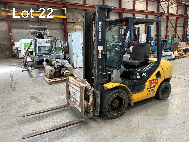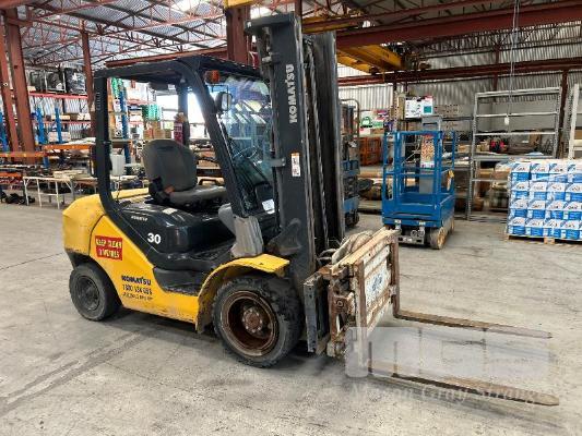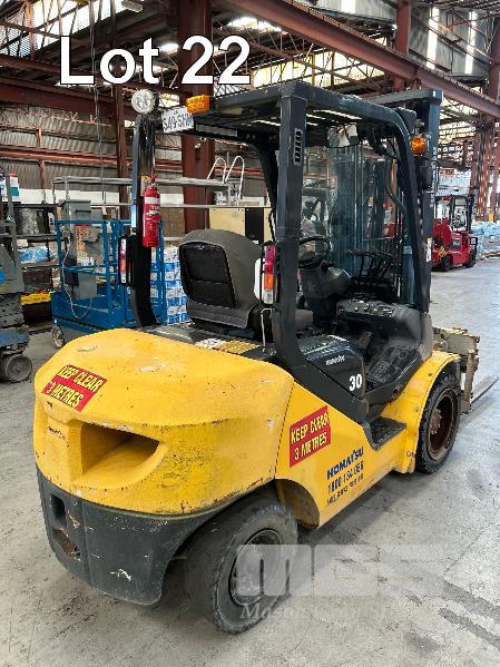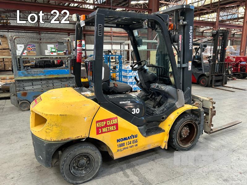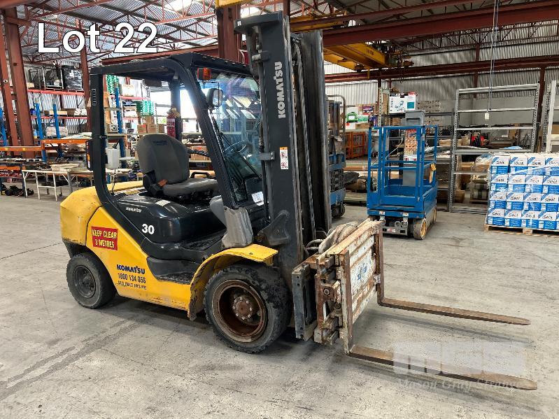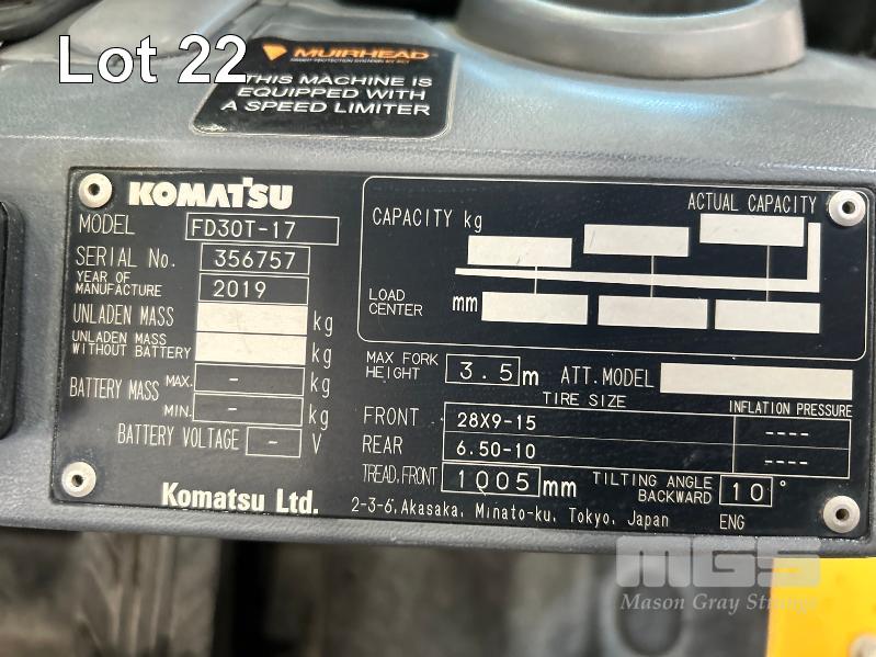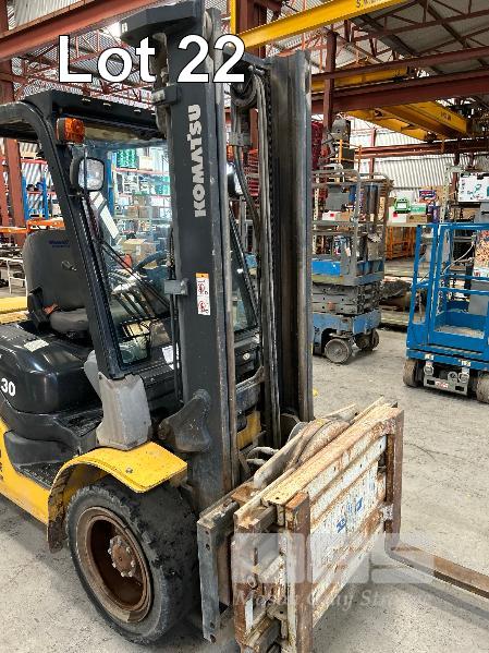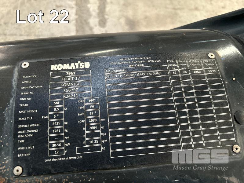 2019 KOMATSU FORKLIFT, 3 TONNE MOD: FD30T-17 REG: S49 SHM (SA) S/NO: 356757 UNIT NO: K24211 MAX LIFT CAP:1,850kg (WITH ROTATOR) FITTED WITH CASCADE 360 DEGREE ROTATOR ATTACHMENT MOD: 25A-CFR-3A-00105 MAX LIFT HEIGHT: 3500mm FORK TYNE SHIFT EXTRA WIDE 2 STAGE MAST 4 CYLINDER DIESEL ENGINE HOUR: 1,664 SHOWING FITTED WITH SAFETY MANAGEMENT SYSTEM SOLID TYRES, 1 x KEY KEY #18