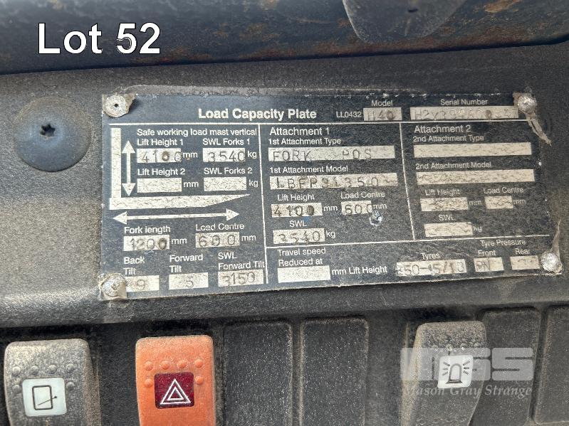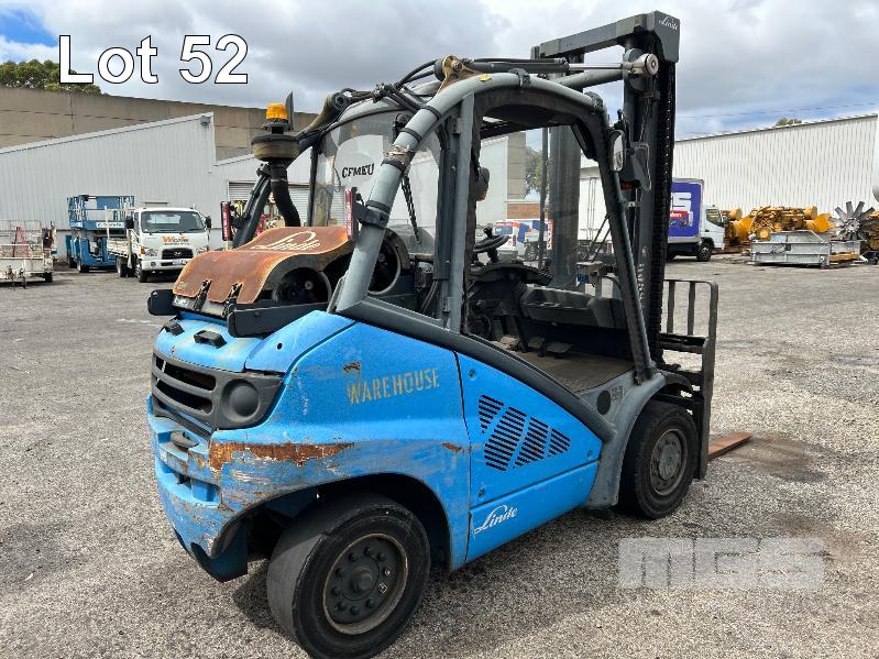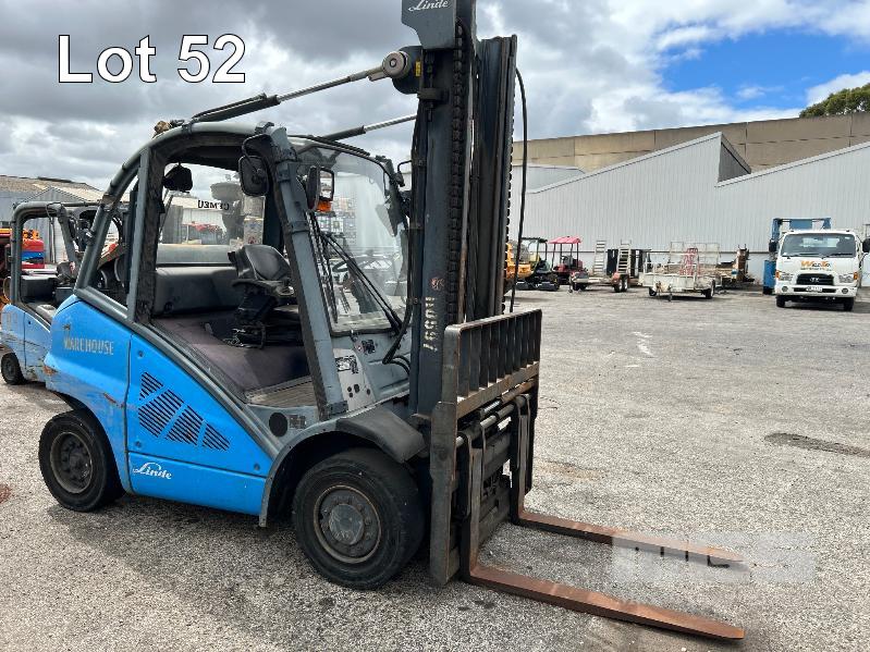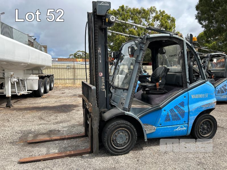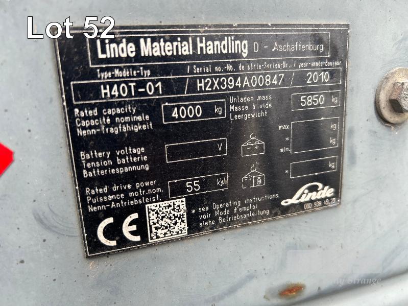 2010 FORKLIFT, LINDE MOD: H40T-01 4 TONNE S/NO: H2X394A00847 PLANT NO: 110597 3 CYLINDER LPG ENGINE, 55kw MAX LIFT HEIGHT: 4100mm 2 STAGE MAST SOLID TYRES, TYNE SHIFT, DUAL GAS BOTTLE CAPACITY WEIGHT SCALES, ACE SLIMLINE II, GRQX-2005 ALL FAULTS, CONDITION UNKNOWN