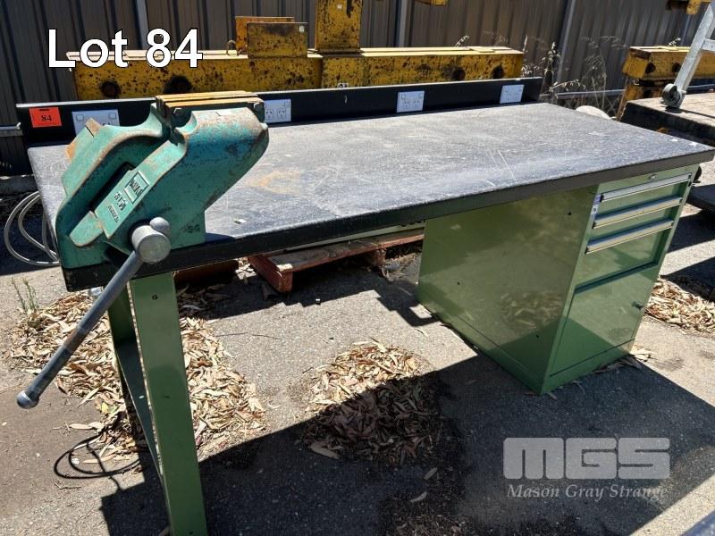 STEEL WORK BENCH, 2200 x 800 x 900mm, WITH POWER POINTS & UNDERBENCH STORAGE DRAWER & DAWN VICE, 150mm