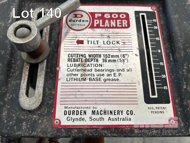 PLANER, DURDEN, MOD: P600 CUT WIDTH: 152mm REBATE DEPTH: 16m BED LENGTH: 1300mm 240V