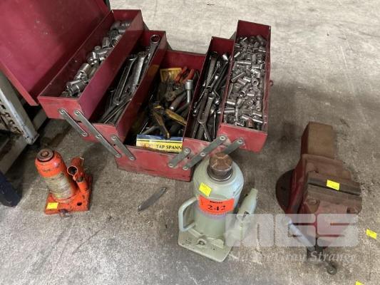 TOOL BOX & ASSORTED HAND TOOLS INCLUDING SOCKET SETS, SPANNERS, ETC, 2 x BOTTLE JACKS & WORKSHOP VICE, 100mm
