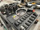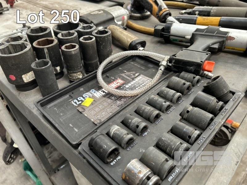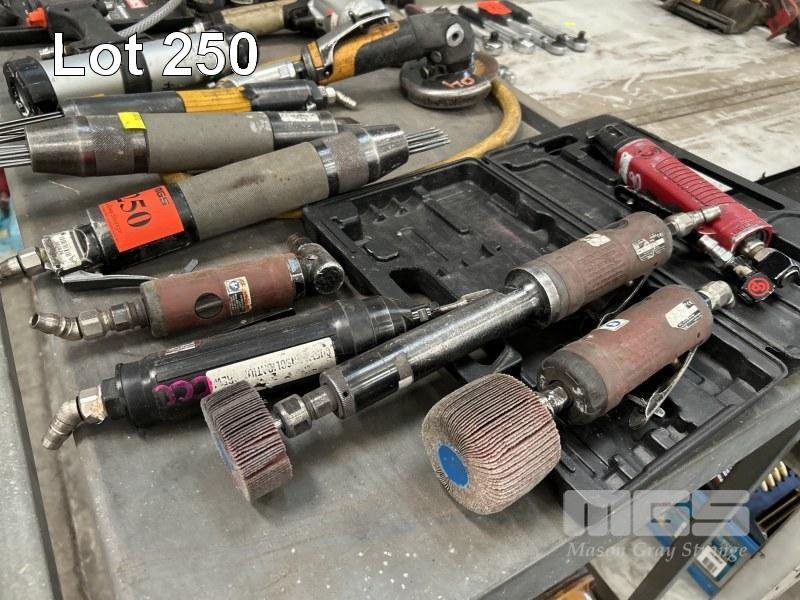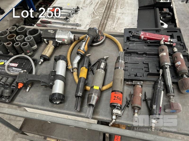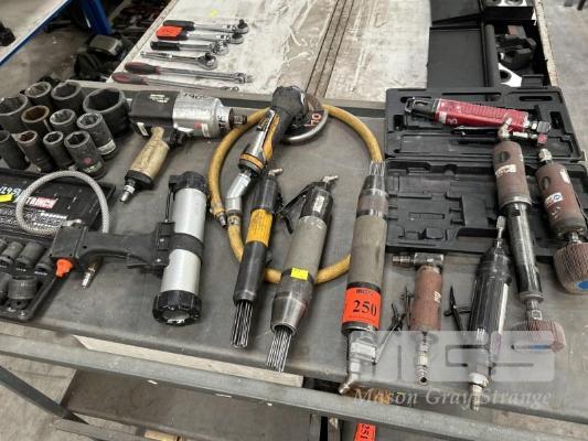 PNEUMATIC POWER TOOLS INCLUDING DIE GRINDERS, ANGLE GRINDER, ATLAS COPCO IMPACT DRIVER & IMPACT SOCKET SET, 3 x NEEDLE DESCALERS, ETC 1 x SHELF