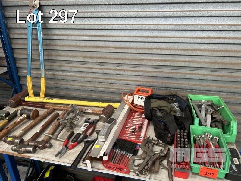 HAND TOOLS INCLUDING HAMMERS, CABLE CUTTERS, SLEDGE HAMMER, PUNCHES, VICE GRIPS, ETC 1 x SHELF