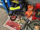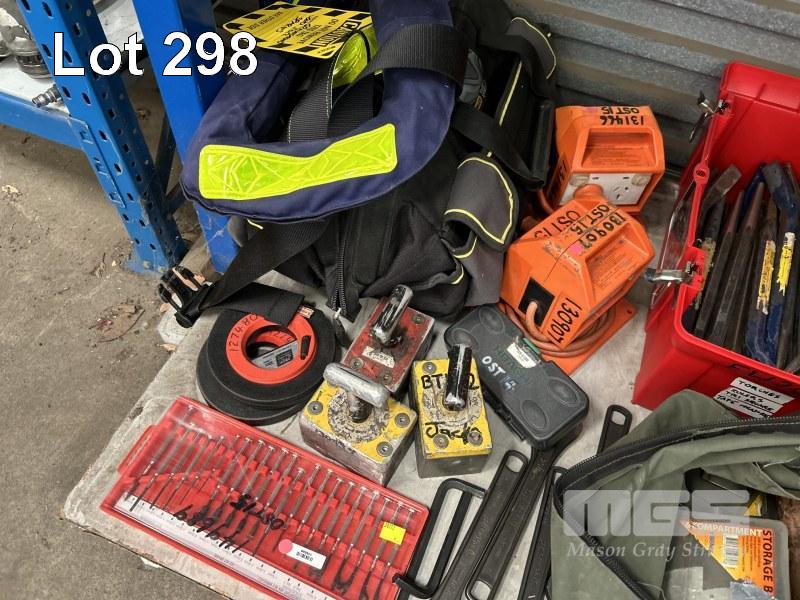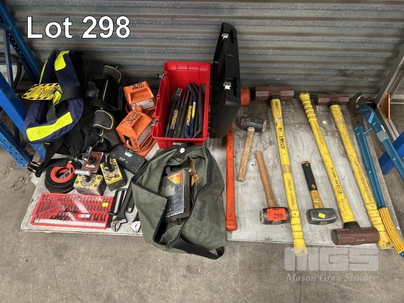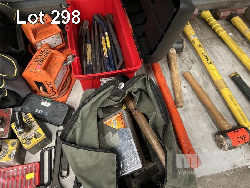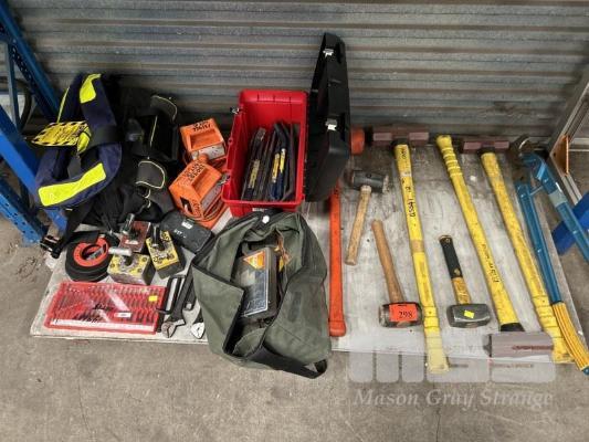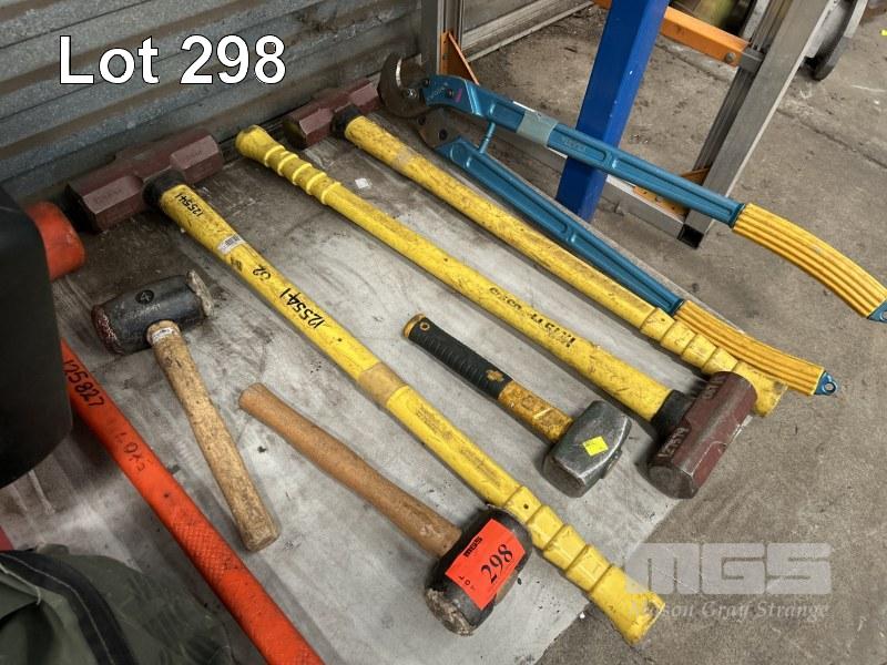 HAND TOOLS INCLUDING HAMMERS, 3 x SLEDGE HAMMERS, DEAD BLOW HAMMER, CABLE CUTER, SHIFTERS, RCD POWER BOXES, PRY BARS, ETC 1 x SHELF