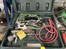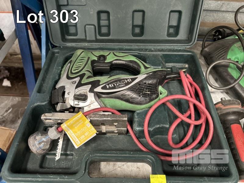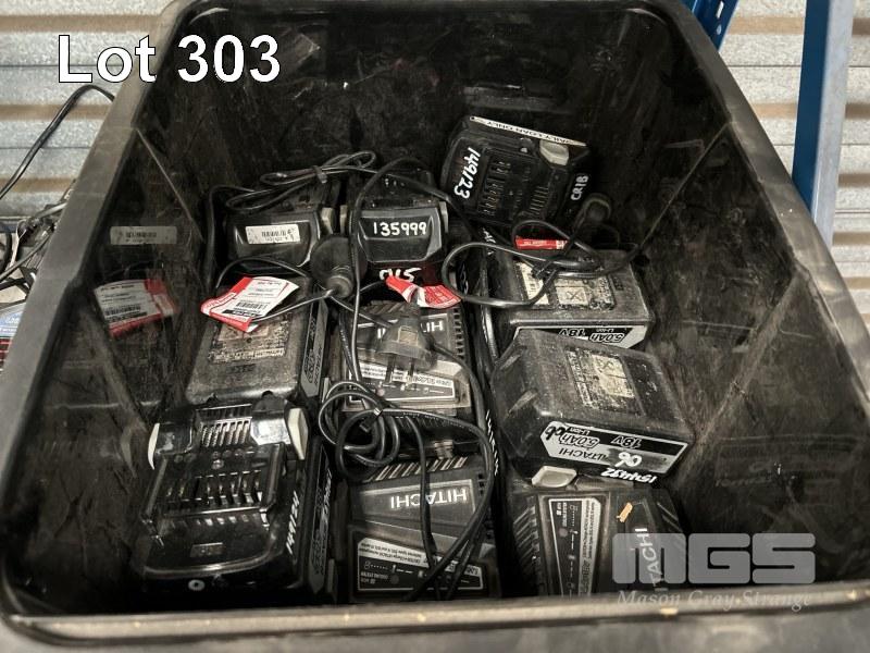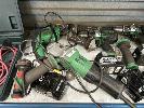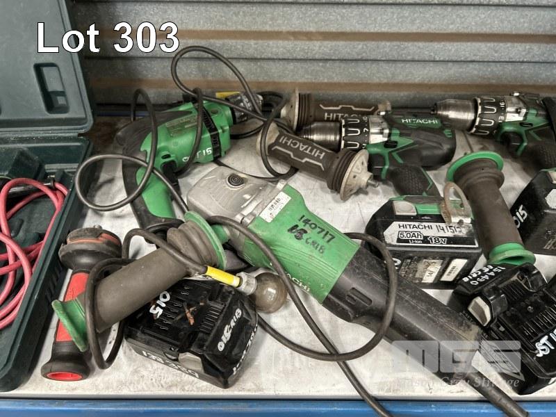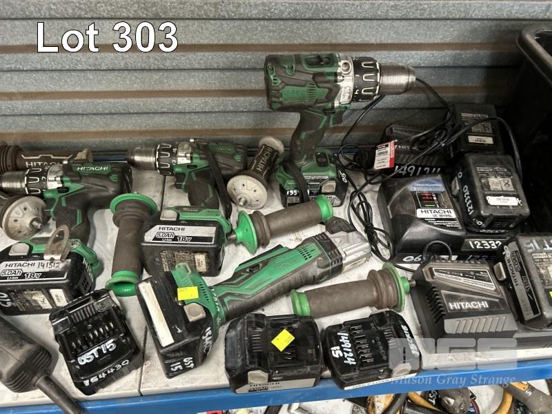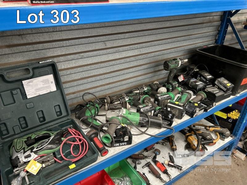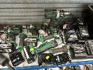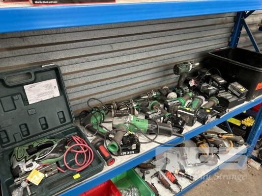HITACHI CORDLESS POWER TOOLS INCLUDING 3 x DRILLS, ANGLE GRINDER WITH 8 x CHARGERS & 18 x BATTERIES INCLUDING JIGSAW, ANGLE GRINDER & DRILL, 240V 1 x SHELF