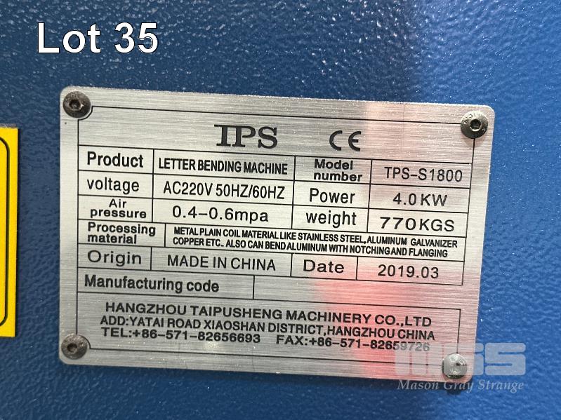 LETTER BENDING MACHINE, TPS MOD: TPS-S1800 DOM: 2019 METAL PLAIN COIL MATERIAL, STAINLESS STEEL, ALLOY, GALV, COPPER, ETC ALSO CAN BEND ALLOY WITH NOTCHING & FLANGING 240V