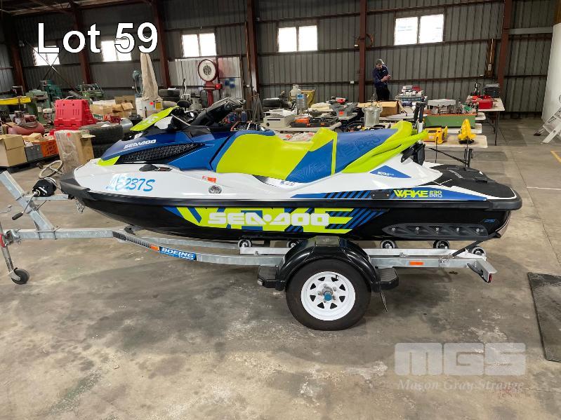 JETSKI, SEA-DOO WAKE PRO 230 REG: LE2375 DOM: 2017 HIN: CA-YDV064241617 HOURS: 67 230 HP WITH FACTORY COVER & SKI POLE WITH 2016 BOEING TRAILER REG: S559 TGY VIN: 105JS2GIME8880 MOD: 105JS2 WITH REG PAPER FOR TRAILER