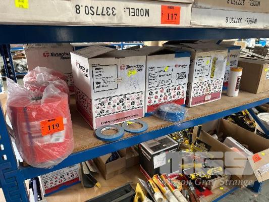 ORANGE FIBREGLASS WALL MESH, 3 x ROLLS & 4 x BOXES VARIOUS BLUE MASKING TAPE & 1 x CARTON DROP DOWN DRAPE