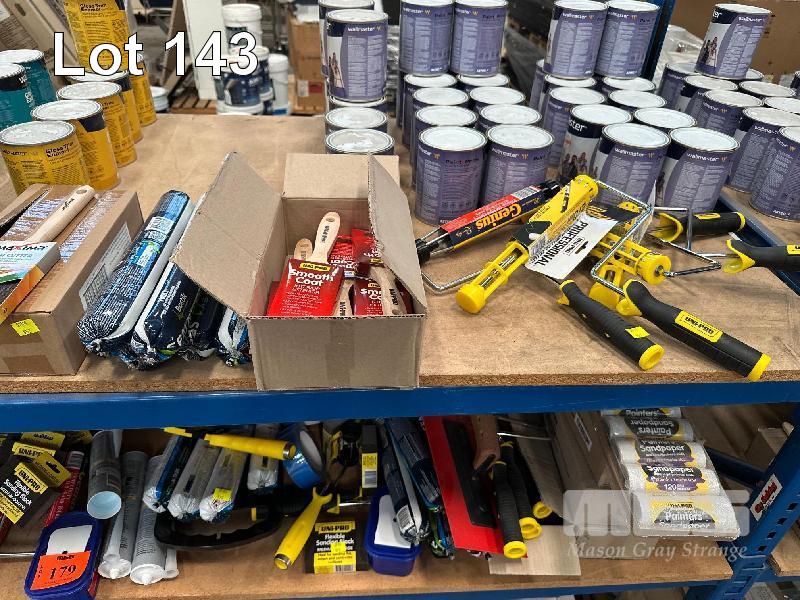 ASSORTED PAINTERS ACCESSORIES INCLUDING, 30 LITRE PAINT BUCKET, SAND BLOCKS, SOLICONES, SEALANTS, ROLLERS & TAPES