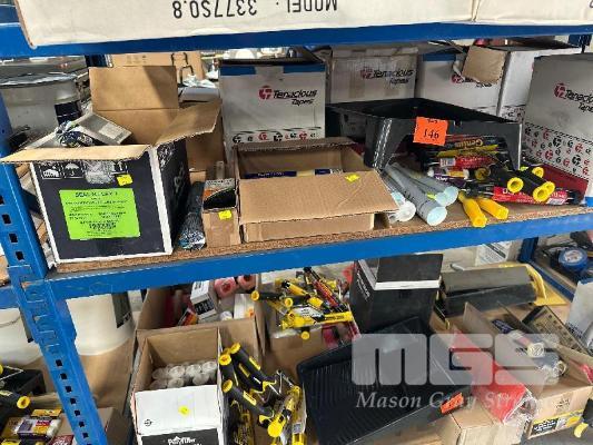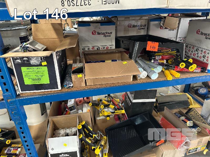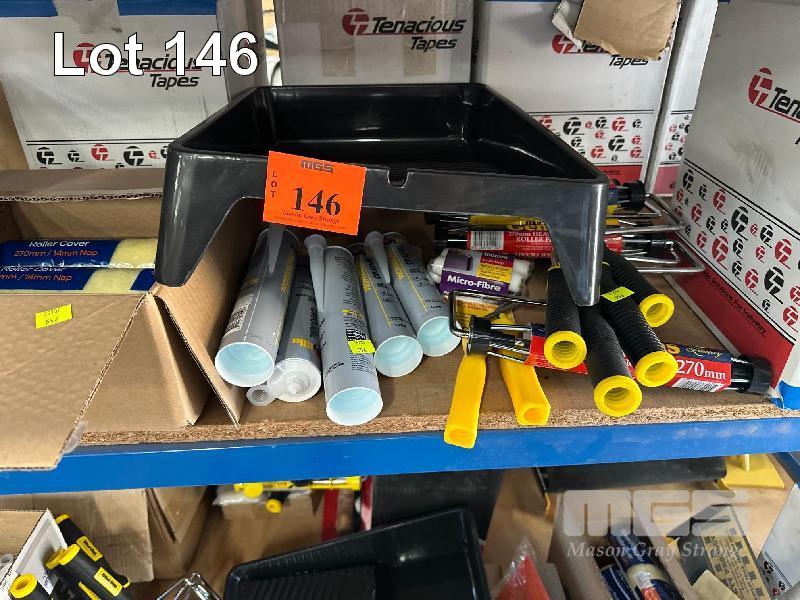 ASSORTED PAINTERS ACCESSORIES INCLUDING, BRUSHES, ROLLERS, SEALERS, ROLLER COVERS, PAINT TRAY & 2 x CARTONS TAPE