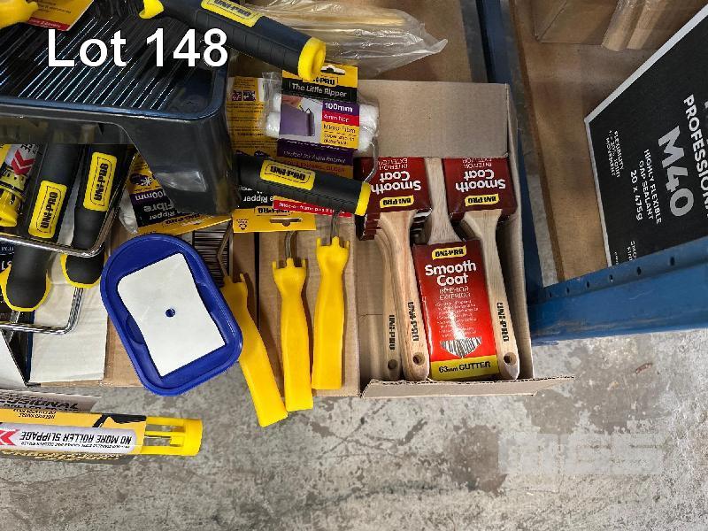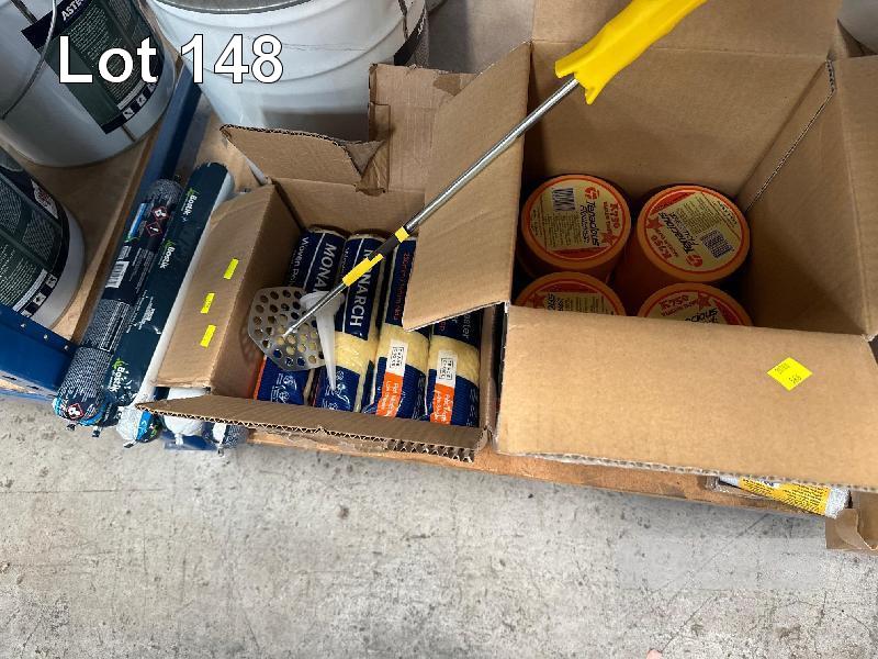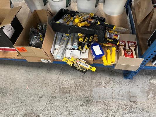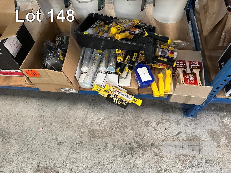 ASSORTED PAINTERS ACCESSORIES INCLUDING, TAPE, ROLLERS, ROLLER COVERS, SEALER, PAINT MIXER, BRUSHES & TROWEL