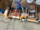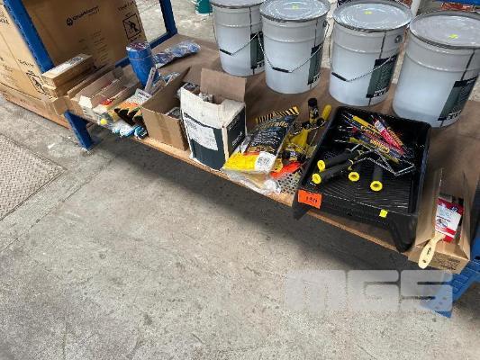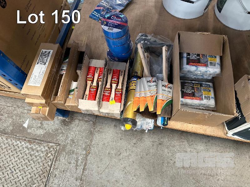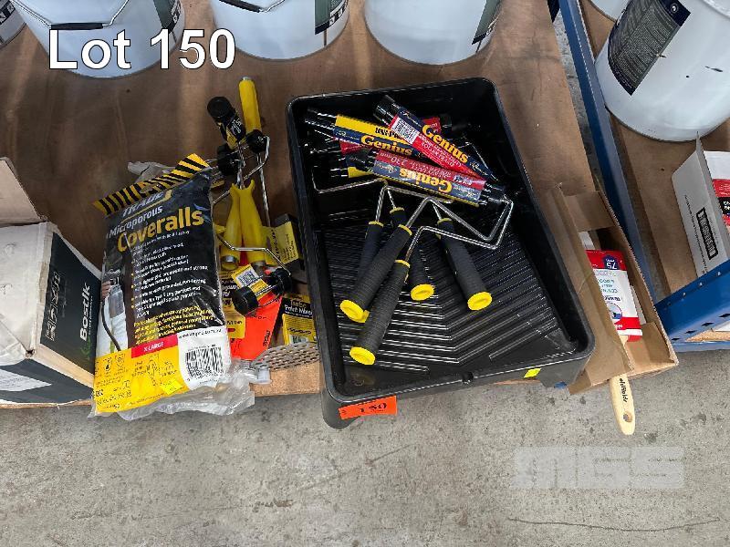 ASSORTED PAINTERS ACCESSORIES INCLUDING, TAPE, ROLLERS & TRAYS, BRUSHES, MIXER, MINI ROLLER COVERS & TROWEL