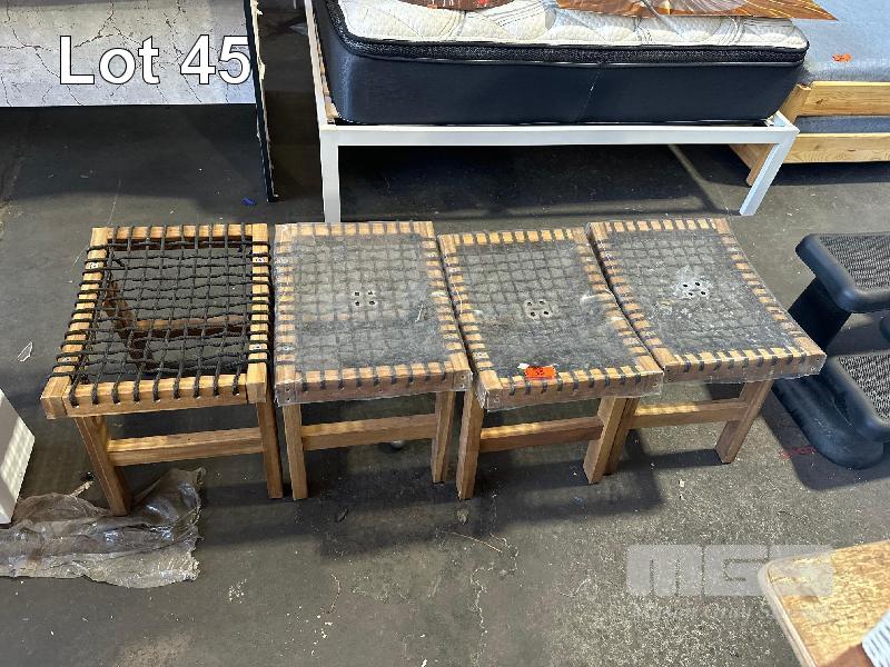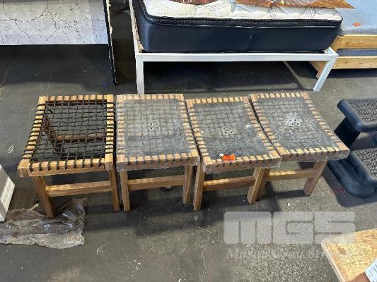 4 x TIMBER STOOLS, WOVEN ROPE SEAT, PLASTIC COVERS ON THREE
