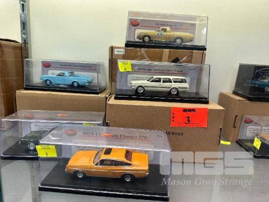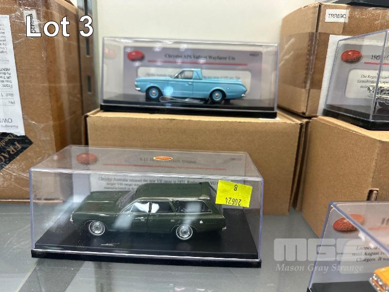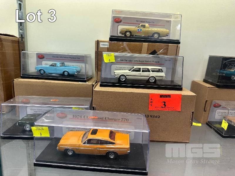 TRAX 1971 VH VALIANT DODGE UTE, YELLOW WITH SERVICE DECAL, 1976 VALIANT CHARGER, YELLOW WITH SUNROOF, 1965 CHRYSLER VALIANT 1P6 UTE, BLUE, 1971 VH REGA STATION WAGON & 1966 CHRYSLER AP6 REGAL SAFARI WAGON, ALPINE WHITE