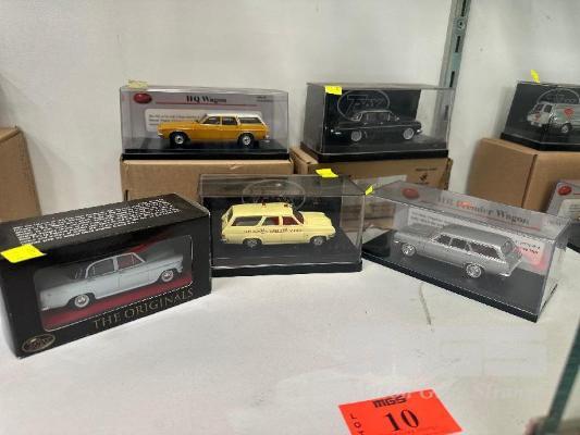 1974 HOLDEN HQ WAGON, MUSTARD & WHITE, 1:43 SCALE, 1965 HD HOLDEN WAGON, PT AUGUSTA AMBULANCE, CREAM, 1967 HR HOLDEN PREMIER STATION WAGON, SILVER, 1956 FE HOLDEN SPECIAL SEDAN, BLUE & 1962 EJ PREMIER HOLDEN SEDAN, BLACK