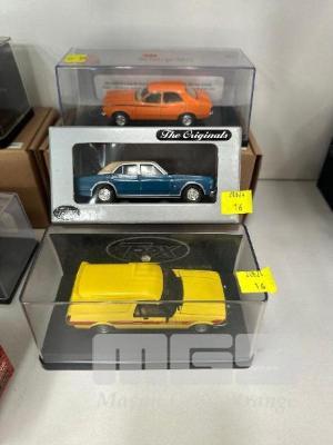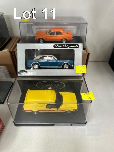 (1986-2011) 25 YEAR ANNIVERSARY XF FORD FALCON PANEL VAN, SILVER/CHROME, 1968 XT FORD FAIRMONT SEDAN,BLUE, BEIGE VINYL ROOF, 1979 FORD XD FALCON SUNDOWNER PANEL VAN, BLAZE YELLOW, 1975 FORD CORTINA XL SEDAN, 4 CYLINDER, YELLOW FIRE, BLACK STRIPES, 1:43 SCALE & 1969 FORD CAPRI 1600 GT YELLOW FIRE WITH BLACK STRIPE