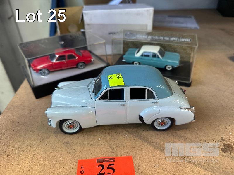 1953 FJ HOLDEN SPECIAL SEDAN, 50TH ANNIVERSARY, TRAX, LIGHT GREY, LIGHT BLUE ROOF, 1971 HQ HOLDEN SEDAN, RED, OPAL SERIES, 1:43 SCALE & HD HOLDEN SPECIAL SEDAN, RELEASED 1965, BLUE/WHITE ROOF