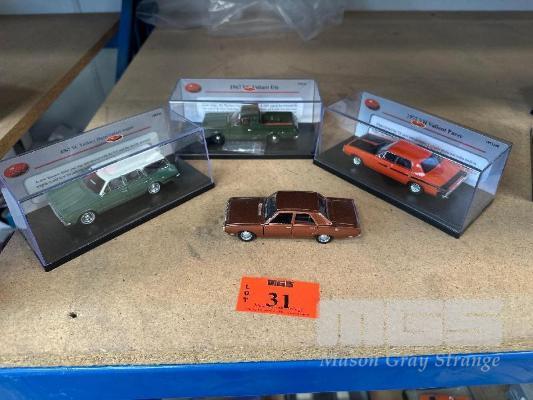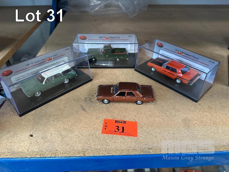 1967 VALIANT REGAL SAFARI WAGON, OLIVE GREEN/WHITE ROOF, TRR130, 1967 VALIANT VC UTE, GREEN, TRR136, 1972 VALIANT VH PACER 4 DOOR SEDAN, ORANGE & BLACK, 139-B, 1:43 SCALE, 1972 DODGE DART 4 DOOR SEDAN, DARK GOLD, 1:43 SCALE