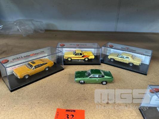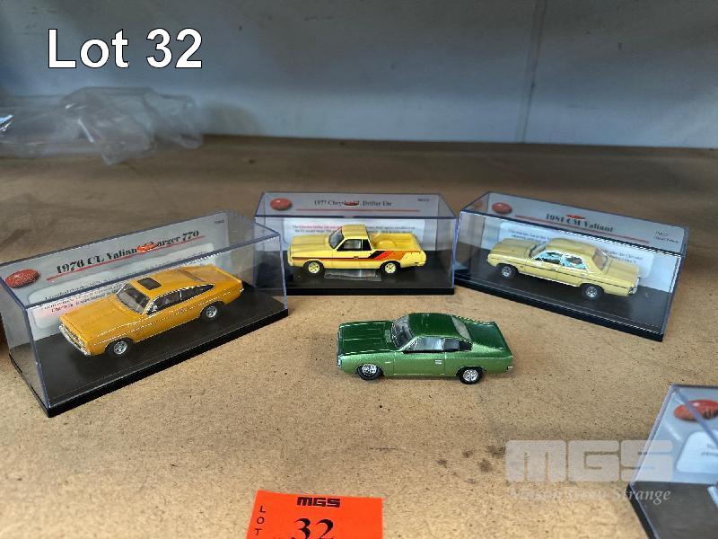 1967 VE CHRYSLER VALIANT SAFARI STATION WAGON, METALLIC TURQUOISE, GREEN AQUA INTERIOR, TRR57B, 1976 CHRYSLER VALIANT CHARGER 770, ORANGE, SUN ROOF, TRAX, TRR26, 1:43, 1971 VH CHARGER 770 318 V8, LIGHT METALLIC GREEN, 1:43 SCALE, 1977 CHRYSLER EL DRIFTER UTE, LEMON & 1981 CM VALIANT CLASSIC YELLOW SEDAN, 1:43 SCALE