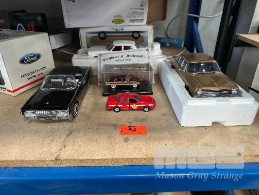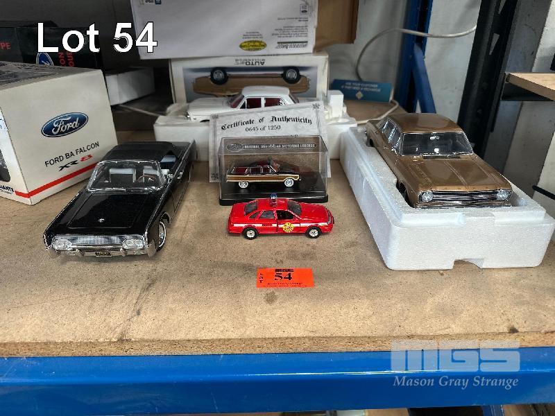 1961 LINCOLN CONTINENTAL SOFT TOP CONVERTIBLE, BLACK PRESIDENT KENNEDY CAR, ASSASSINATION, 1990 FORD TAURUS RED FIRE CHIEF CAR, 1:36 SCALE, 1963 FORD XL FALCON WAGON, SQUIRE BLACK, 1:43 SCALE, 1965 FORD XP FALCON SEDAN, WHITE, RED INTERIOR, FORD FALCON XR GT SEDAN, GOLD, 1:18 SCALE
