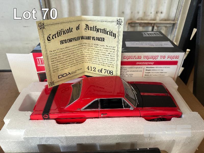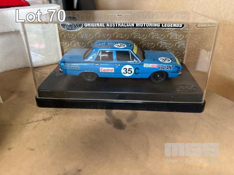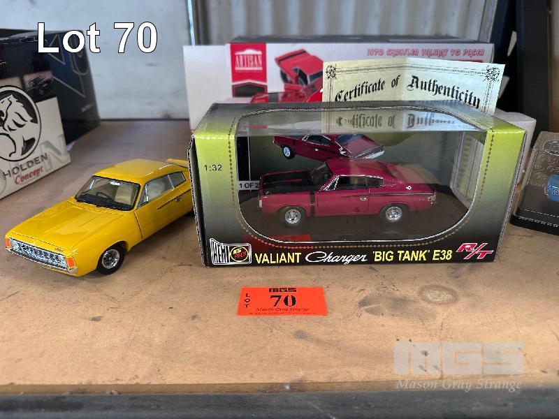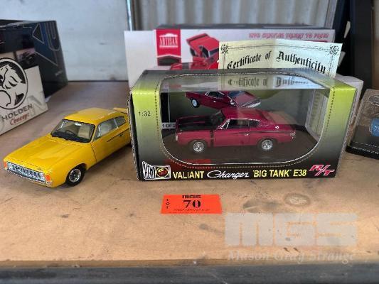 VALIANT CHARGER BIG TANK, PINK, VJ VALIANT CHARGER 770, YELLOW, 1970 CHRYSLER VALIANT VG PACER, 2 DOOR COUPE, RED/BLACK STRIPES & 1970 CHRYSLER VG PACER, BATHURST RACE CAR, NO 35, CHIVAS/RYAN 2ND IN CLASS, 4TH OUTRIGHT, 1:43 SCALE