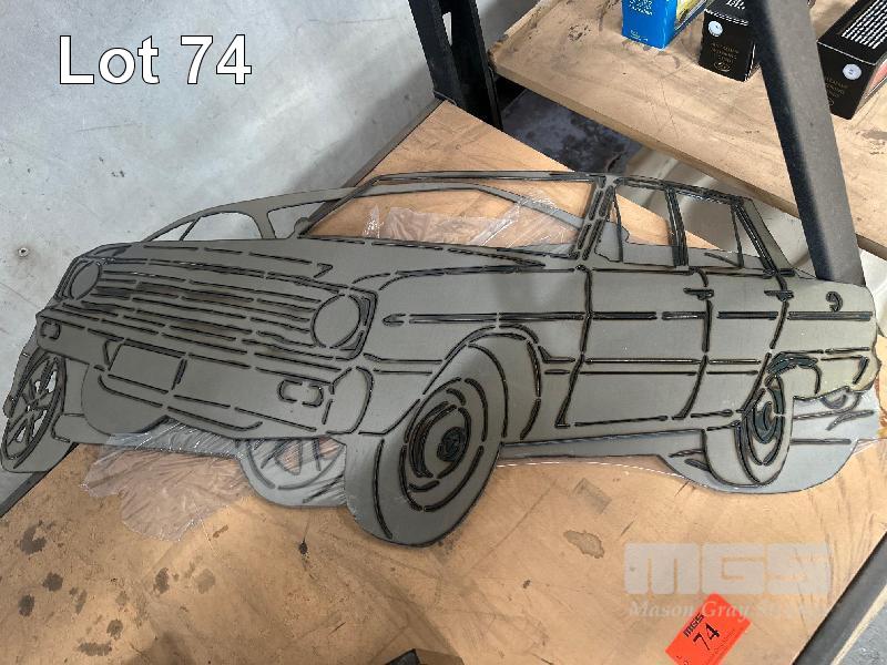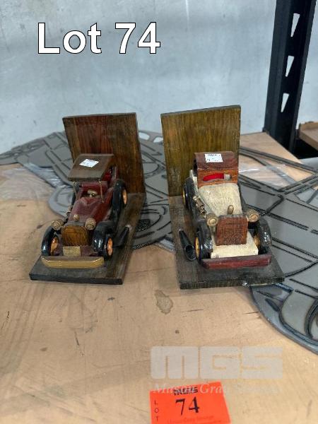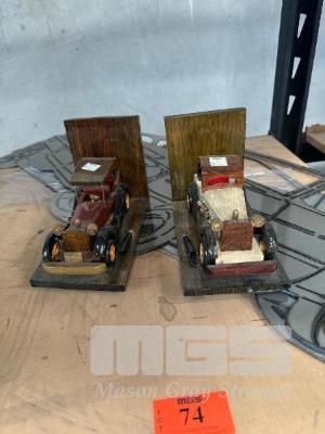 2 x VINTAGE CAR BOOKENDS & 2 x METAL CUT OUT CARS