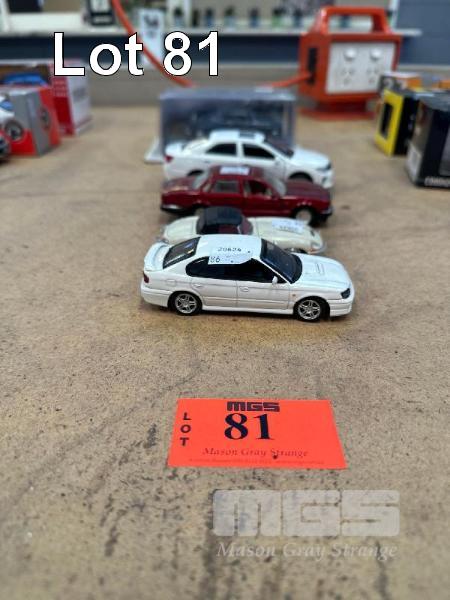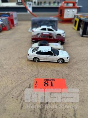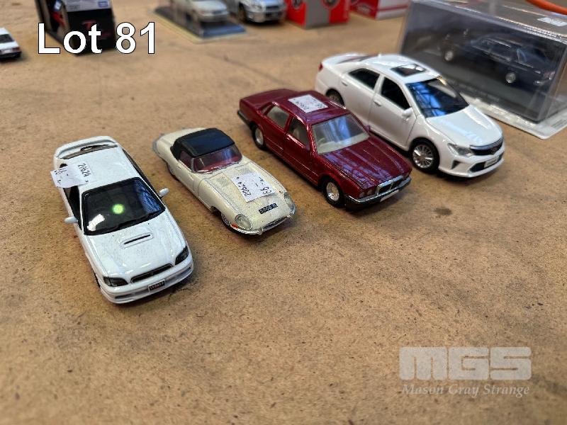 SUBARU LEGACY SEDAN, WHITE, 1:43, TOYOTA CROWN SEDAN, BLACK, 2017 TOYOTA XV50 CAMRY, WHITE, 1:36 SCALE, E-TYPE JAGUAR, COUPE, CREAM & BLACK ROOF & XJ-6 JAGUAR SEDAN, RED/SUNROOF