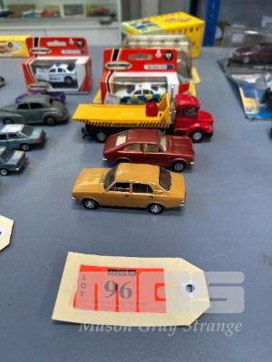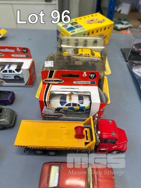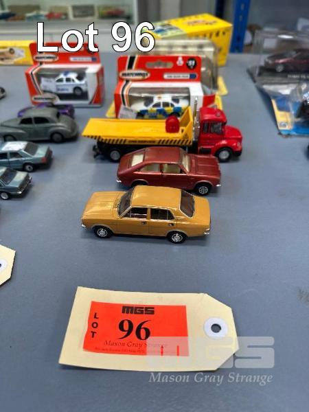 DIECAST FLATBED SERVICE TRUCK, RED/YELLOW, MORRIS MARINA 1800 SEDAN, BROWN, MORRIS MARINA COUPE, BROWN, MATCHBOX FORD FALCON POLICE CAR, WHITE/BLUE/YELLOW 1958 LONDON TAXI,BLACK & 1992 NEW YORK TAXI, YELLOW
