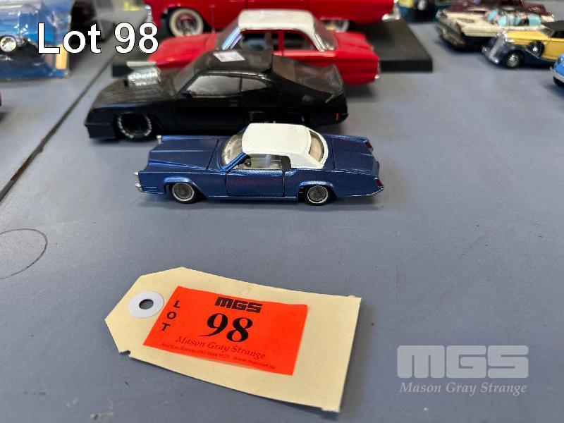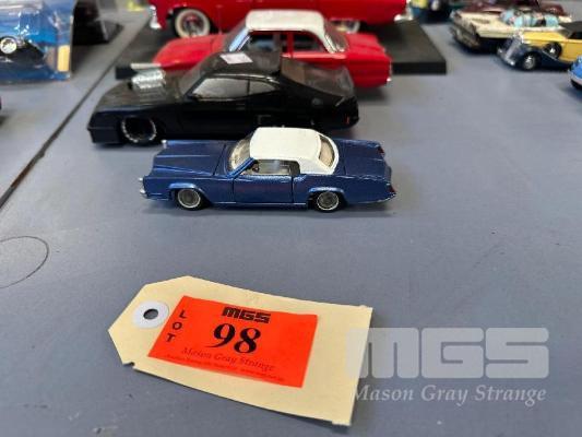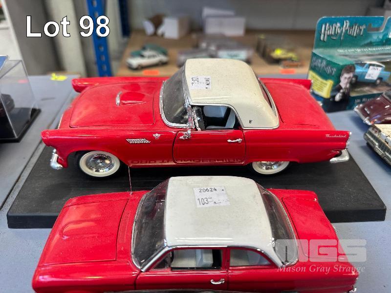 1955 FORD THUNDERBIRD 2 DOOR COUPE, RED/WHITE ROOF, 1970 CADILLAC ELDORADO COUPE, BLUE/WHITE, RESIN MAD MAX INTERCEPTOR FORD COUPE, BLACK, 1960 XR FORD FALCON COUPE, RED/WHITE ROOF, DIECAST