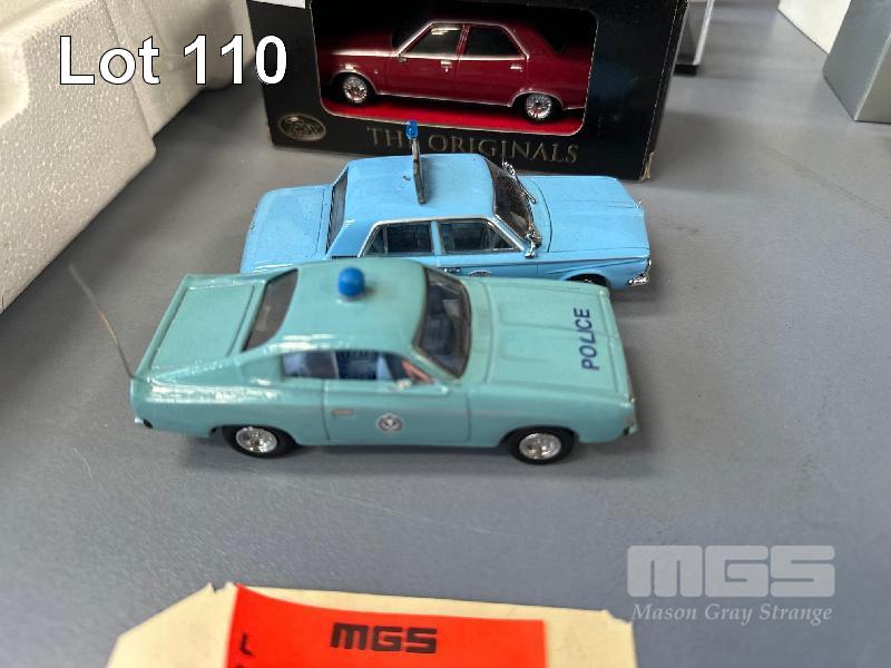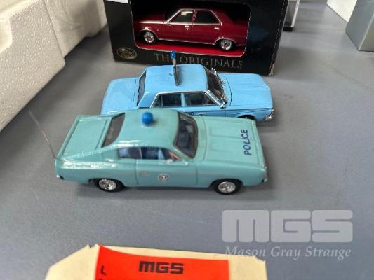 1971 VH CHRYSLER VALIANT CHARGER, 2 DOOR COUPE, SA POLICE CAR, BLUE, 1:43 SCALE, 1963 AP5 CHRYSLER VALIANT 4 DOOR SEDAN, SA POLICE CAR, BLUE, 1970 AUSTIN KIMBERLEY MKI SEDAN, YELLOW, 1974 LEYLAND FORCE 7 COUPE, ORANGE, 1969 VF VALIANT PACER ALPINE, 4 DOOR SEDAN & 1973 LEYLAND P76 SUPER SEDAN, MAROON