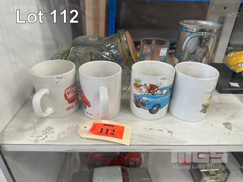 4 x ASSORTED HOLDEN & HOTLINE 20 PLUS COFFEE MUGS & 1 x CHRYSLER BEER MUG, COOPER & SONS BIG BARREL MONEY TIN, VINTAGE LARGE GLASS VOLKSWAGEN BEETLE CANISTER, MADE IN SPAIN