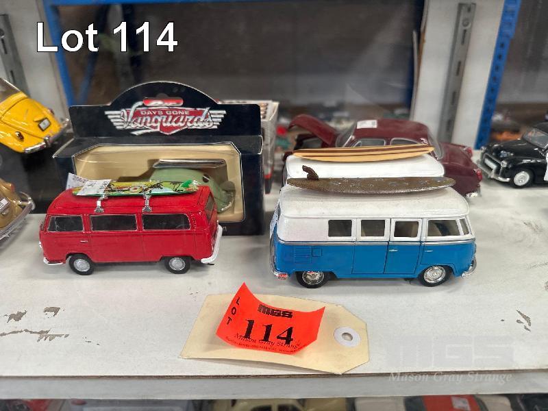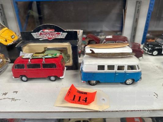 VOLKSWAGEN 1600 2 DOOR COUPE, RED, 1:24 SCALE, 1960'S VOLKSWAGEN BEETLE 2 DOOR, BLUE DIECAST, 1:32, 1962 VOLKSWAGEN KOMBI BUS, BLUE/WHITE WITH SURFBOARD ON TOP, VW KOMBI BUS, RES WITH SURFBOARD ON TOP, 1952 VOLKSWAGEN BEETLE 2 DOOR PASTEL GREEN, 1962 VOLKSWAGEN MICRO BUS, DARK GREEN/WHITE, KINSMART, 1:32 SCALE