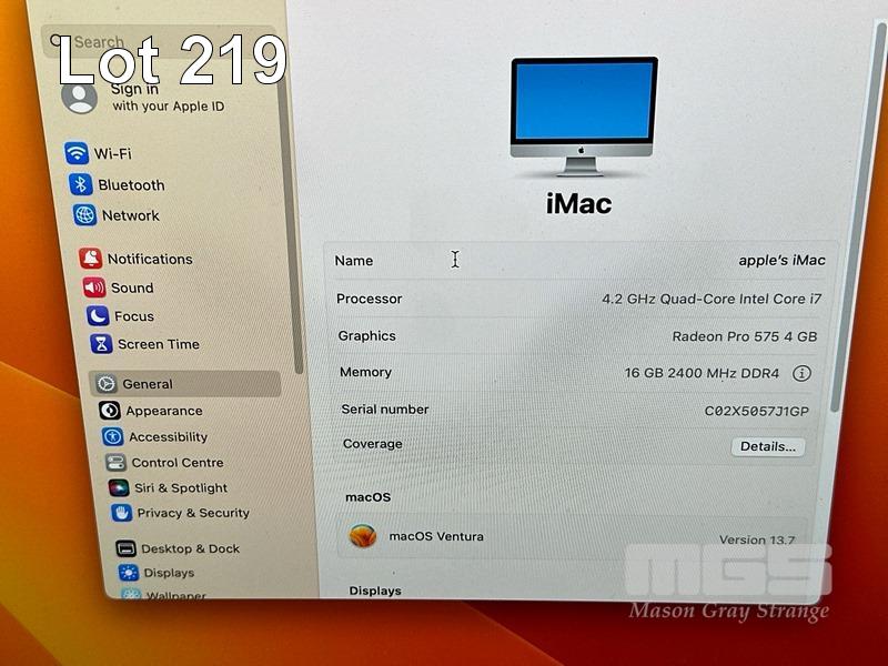 APPLE iMAC (A1419), CORE i7 7700K (7TH GEN) @ 4.2GHz, 16GB DDR4 RAM, 256GB SSD, BUILT-IN 27" RETINA 5K DISPLAY (5120x2880), 4GB RADEON PRO 575 VIDEO, Wi-Fi, BLUETOOTH, MAC OS 13 INSTALLED, MACALLY KEYBOARD & MOUSE S/N:C02X5057J1GP