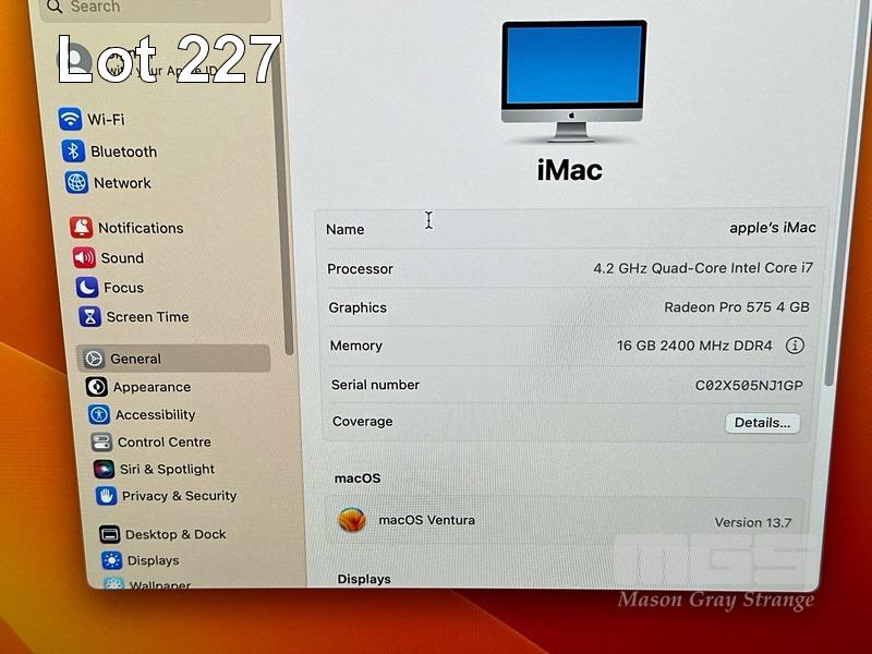 APPLE iMAC (A1419), CORE i7 7700K (7TH GEN) @ 4.2GHz, 16GB DDR4 RAM, 256GB SSD, BUILT-IN 27" RETINA 5K DISPLAY (5120x2880), 4GB RADEON PRO 575 VIDEO, Wi-Fi, BLUETOOTH, MAC OS 13 INSTALLED, MACALLY KEYBOARD & MOUSE S/N:C02X505NJ1GP